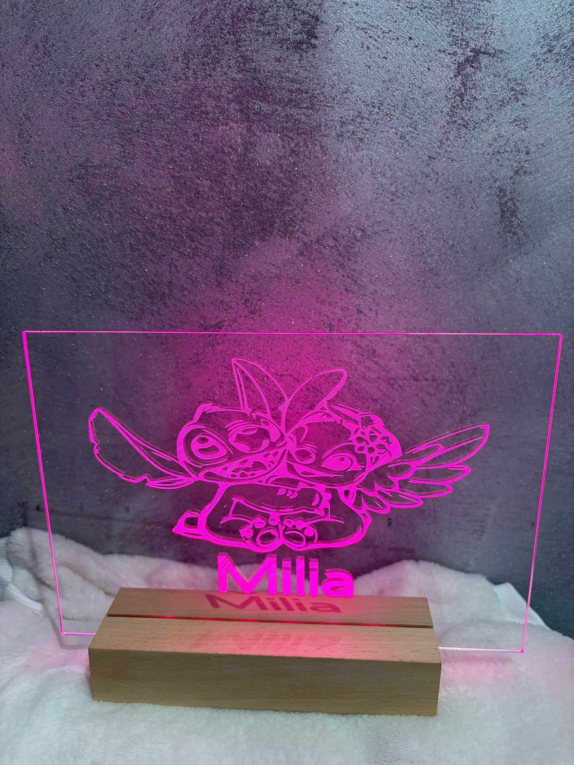 socle en bois lumineux avec piles panneaux en acrylique forme rectangle 15*22 cm.